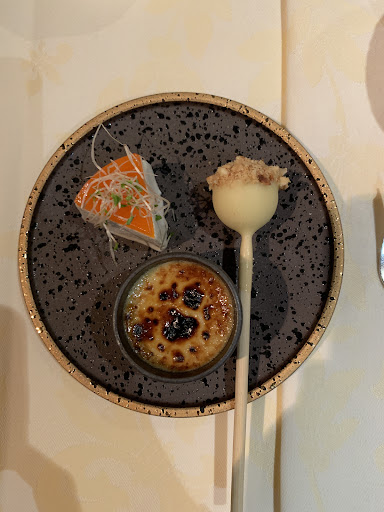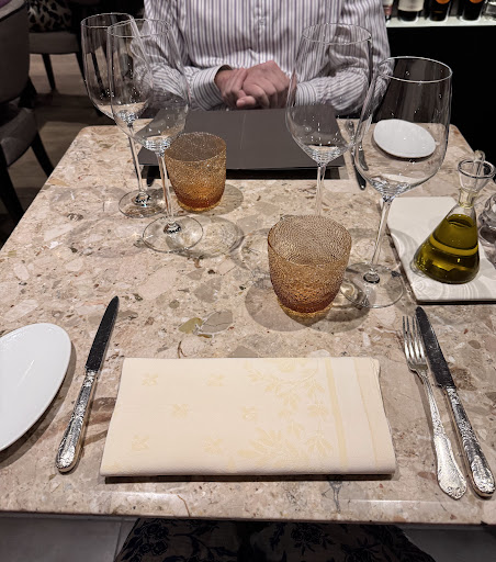 The table is beautifully set to start, the cutlery showcasing a timeless, classic look that elevated the ambiance at the table. We were first offered an aperetif, for which we chose the house special cocktail with a base of gin, shaken basilic and cane sugar. Apparently, this combination of ingredients allows the taste and aroma of fresh basil to shine - it was the most unique and refreshing cocktail I have tried in a while thanks to the exceptionally delightful scent of basil. We also ordered a bottle of Chateau Laroze Saint-Emilion from the restaurants extensive selection of highly rated wines to pair with our dinner and were greatly pleased. Our glasses were refilled without us ever having to ask - such is the attentiveness of the staff. The design and feel of the menus to the touch is impeccable, distincting the great care that is put into every aspect of the restaurant experience.