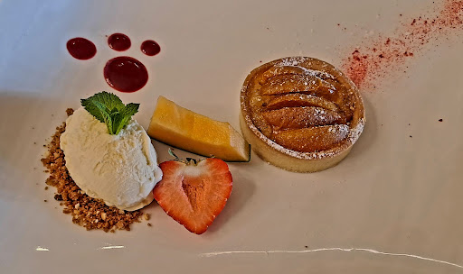 Et on termine le repas par la touche sucrée tartelette frangipane noisettes, abricots et glace lait d'amande. La frangipane maison avec les abricots cuits et la glace tournée minuté, c'est une tuerie ! Il faut bien avouer qu'en général les desserts réalisés par les cuisiner sont assez moyens mais vraiment l'ensemble est très réussi.