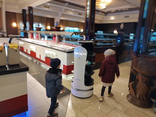 Was op voorhand al niet te vinden voor deze formule, niets tegen buffet, maar de Chinese/Japanse keuken is niet mijn ding op een simpeleloempia na. Verwachtingen waren dus al niet hoog op voorhand. Gelukkig waren er een aantal gewone dingen ook, zoals gerookte zalm, maatjes, reuzegarnaal en "surimi" met wat verse groenten als voorgerecht. Daarvan had het assortiment gerust wat uitgebreider dan tomaat en komkommer mogen zijn. Dat er geen (rivier)kreeftjes meer waren vond mijn mama, die hier al eerder kwam, wel sneu. Om op safe te spelen, gekozen voor teppanyaki: stuk zalm, wat scampi, inktvis en kikkerbilletjes (dingen die ik lust als ze op een simpele manier zijn klaargemaakt); wat peper en zout, en nog wat extra peper en zout, groot was echter mijn verbazing en teleurstelling toen er zonder vraag of het OK was, een groene smurrie over zalm, scampi gegooid werd, mijn "stop" en ander protest was duidelijk, dus schraapte hij er zoveel mogelijk terug af. Buffetten met ondefinieerbare gerechten waar geen kaartje bijstaat wat het is, vind ik echt niet kunnen (allergie aan oregano én typische Chinese kruiden zullen hier wel aan de basis liggen), dus simpel paar kroketjes bij genomen, en de potten met vermoedelijk groenten gelaten voor wat ze waren. Voor de wok was er alweer wat keuze tussen ingrediënten, sommige potten al leeg, maar de keuze tussen de saus, vooral pikant met aanduiding met pepertjes, ik lust heel graag looksaus, maar waarom moet dat een pikante versie alleen zijn. Dus nog wat groenten, scampi en zonder saus laten wokken, kwestie van geen risico's te nemen. Dessert dat is echt iets voor mij, alleen vond ik dat buffet nu niet echt wow. Had dit niet op uitnodiging geweest, dan hadden ze mij hier gewoon nooit gezien. En dat je door zijn robot naar tafel wordt gebracht, vind ik super onpersoonlijk, geef mij maar vriendelijk en...