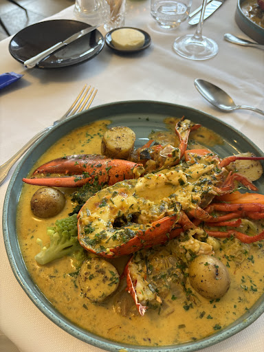 2023-09 Met 4 geluncht met het 4-gangen suggestiemenu@ 50€pp. 5 keuzes aan voorgerechten waarvan 3€ supplement voor verse oesters en 8€ voor een halve kreeft. Idem dito voor de halve kreeft van de 5 keuzes hoofdgerechten. Er waren simpele hapjes vooraf en als tussengerecht kozen we voor de uitstekende mango-passievrucht sorbet met citroenjenever. Alles vriendelijk gebracht, aangenaam interieur en buitenterras, mooi opgemaakte schotels, lekker op smaak en met de juiste cuisson. Spijtig dat het bindweefsel van de chateaubriand beschadigd was. De Irish coffee van het dessert was mooi in 3 lagen zoals het eigenlijk hoort, maar vrijwel nergens meer zo wordt geserveerd. De drankenkaart is zeer redelijk geprijsd. We genoten van de fles rode wijn gemaakt van 100% monastrell-druif uit Alicante. Het restaurant is...