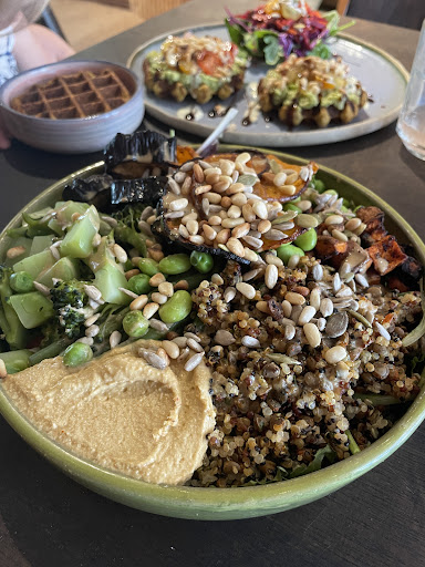 Het eten is best kleurrijk, noten, zaden, vegan... netjes en verzorgd gebracht.