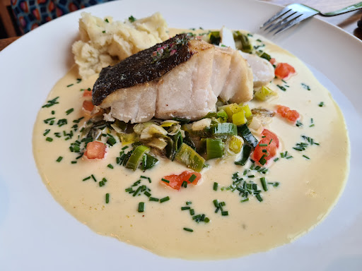 Verzorgde brasserie met een leuke kaart met enkele klassieke en originele gerechten, van koninginnehapje tot balletjes in tomatensaus en roodbaars met risotto. Prima wijnen (rosĂ©) en voldoende variatie aan frisdranken en bieren. Beetje brood met boter als amuse is altijd leuk. Porties zijn - gezien de stevige prijs - veel te klein. Ik nam de roodbaars met risotto en deze was qua smaak prima, maar véél te weinig. Normaal werd dit vergezeld met brood volgens de kaart, maar werd niet geserveerd. Om de goede vrede te bewaren, heb ik er Ă la minute niets van gezegd⊠Want de portie van mijn vrouw, nochtans geen grote eter, was ook veel te klein. Ze nam de suggestie van doperwtenrisotto met scampiâs (3!?) en ging helaas met honger van tafel. Zij heeft er wel meteen een opmerking op gegeven en dit werd gecompenseerd met enkele zeer dunne stukjes brood, die eigenlijk bij mijn gerecht moesten komen (?). Bovendien nam onze zoon van 8 een volwassen portie gehaktballetjes die hij zonder problemen op kreeg en hij is een heel kleine eter. We wilden eigenlijk nog een dessert nemen, maar wouden niet nog eens teleurgesteld worden. Bediening is hulpvaardig en vriendelijk. Fungeerde als ons klankbord, want zij kan er ook niets aan doen natuurlijk, maar ging er prima mee om, maar er kwam geen oplossing buiten âde keuken gaat het herzienâ. Terras mist wat inrichting, maar binnen leek het zeker gezellig. Ruime parking voor de deur. Prijs - kwantiteit - kwaliteit zit het volgens mij wat scheef, maar ik kan natuurlijk niet oordelen over food- en personeelskost of winstmarge ;) Al bij al: lekker (!), naar mijn gevoel te weinig...