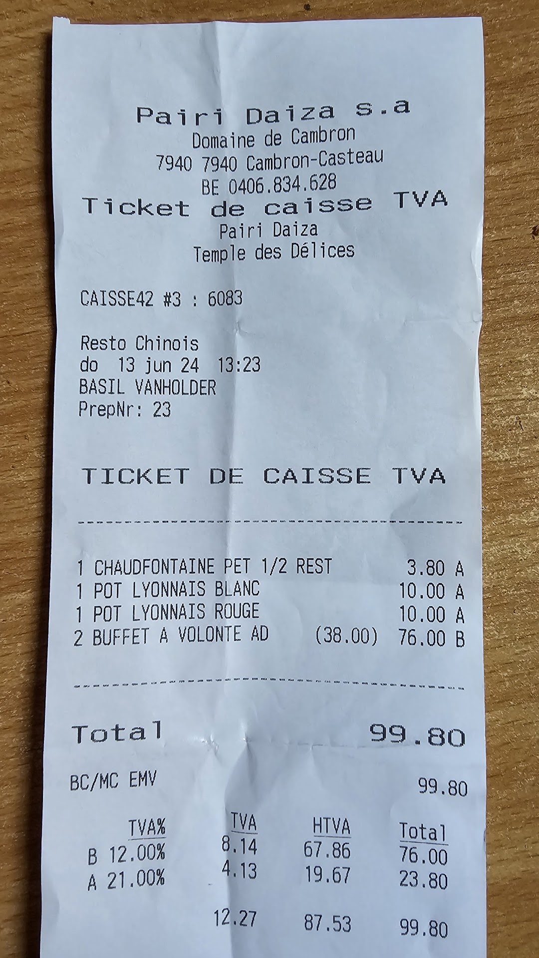 Read moreLe cadre du restaurant est calme et agréable. Remarquable dans ce restaurant, les boiseries aux murs et aux plafonds qui sont exceptionnelles. Nous y avons bien mangé et la formule à volonté plaira aux grands mangeurs. Le chef de salle et les serveuses/serveurs font tout pour rendre le repas agréable. Ils sont disponibles et rapides : Merci. Quelques bémols toutefois. un plat nous a moins plu : les raviolis au niveau texture, mais c'est une question de goût, très peu de choix de vins, et au final, le prix par personne est élevé. Sans indiquer ce que nous avons réglés, c'est le même prix que dans un bon restaurant chinois de la région, mais avec service à table et de meilleurs vins. Par exemple, pour finir le repas, nous avons choisi deux thés qui reviennent à 12 € ce qui me semble élevé. Même chose pour le verre de vin par rapport à la carafe. Je pense surtout aux familles un peu plus nombreuse qui hésiteront à s'y rendre. Le nombre de place est limité, à partir de 12h30, il y a des files à l'entrée, mais très bien gérées. Un seul regret, comme le parc n'ouvre plus en soirée, il n'y a plus de possibilité d'y souper. Je suis certain qu'en soirée, l'ambiance doit y être...