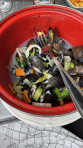 Read moreLast night we arrived in Bruges late and given the very different closing times from the Italian ones we quickly chose this restaurant for dinner. Driven by curiosity, we chose mules and frites for 2 people but the waiter didn't explain to us that each portion included about 1kg of abundant mussels ... among other things, there weren't many variations so they brought us simple mussels with vegetables , while the fries were the classic "frozen" ones. Furthermore, the waiter who took the order refused to serve us "tap water"...obviously we didn't want to make a fuss but our waiter certainly took advantage of two last-minute tourists. In fact, his colleague, much more courteous, later explained to us that it was possible to take half a portion of mussels, or a portion for two, precisely because they are very abundant. Therefore I can't recommend this place and not so much for a cheap speech as for the way the waiter...