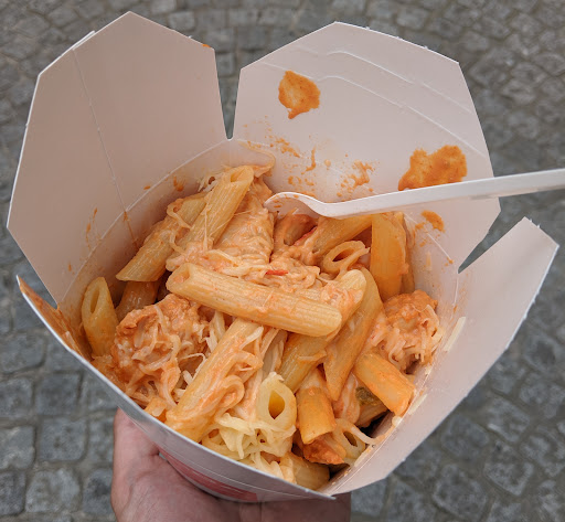 Friendly staff and fast service make this the ideal lunch time pasta bar. The pasta is not the best you have ever eaten but it certainly isn't the worst either. It is good for the price, even though it is not the cheapest pasta bar in the world (or Bruges for that matter). The service, taste and location make it a very popular restaurant, particularly for students, which means that there will be a long line during the peak hours (between 12h and 14h). Bocca is mostly aimed at take away. Most costumers will buy a little bucket of pasta to eat while roaming around Bruges. It is however possible to eat inside the restaurant. Don't expect a romantic spot however as the inside of the restaurant only has one long table where everyone sits at. This is great for social contact but less so...