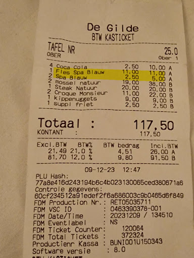 Read moreCi siamo fermati in questo ristorante a Bruges per pranzare, in cerca del tipico piatto belga "cozze e patate". Eravamo in sei, da bere abbiamo ordinato 2 coca cole ed una bottiglia d'acqua. Ci portano due coca cole e 4 bicchieri (chi ha ordinato una cola non può aver voglia anche di acqua secondo loro..). Chiediamo due bicchieri in più, due volte, a due camerieri diversi. Alla fine si presenta un cameriere con due bicchieri pieni d'acqua..bah. La bistecca ordinata specificando chiaramente che la cottura doveva essere "well done" arriva ancora sanguinante e quando si chiede se si può cuocere di più partono le "imprecazioni" nella tipica ed incomprensibile lingua delle fiandre.. già al momento di prendere l'ordinazione il cameriere era sembrato scocciato ed infastidito dal fatto che alcuni commensali (3 ragazzi adolescenti) erano indecisi su cosa ordinare e facevano domande su cosa c'era nella pietanza scelta.. Comunque, stanchi ed infreddoliti (giornata di pioggia e di vento freddo) resistiamo alla tentazione di alzarci ed andarcene e attendiamo le nostre ordinazioni. Alla fine il piatto cozze e patate valeva l'esperienza, tutto il resto no. Ciliegina sulla torta il conto: 11 euro per una bottiglia d'acqua e 2.50 € per ogni bicchiera d'acqua portato (e non richiesto!). E no, nel menù il prezzo dell'acqua non...
