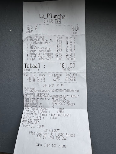 Read moreNa drukke weken uitkijken naar een gezellige avond ... Helaas... We bestelden een aperitief met tapas mix ..we gn gezellig aperitieven .. Na bestelling kregen we ruim na 20 min onze aperitief..ondertussen na enige tijd half leeg en hadden we nog steeds ons tapas mix niet ..uiteindelijk kregen we de hoofdmaaltijd mijn man vroeg de tomahawk 875 gr stond er op de kaart maar ook dit was een teleurstelling en een goed stuk vlees kreeg hij redelijk doorbakken en zeker geen 875 gr ..uitgebakken . Ik bestelde de steengrill vis .. Wou ik eraan beginnen was de steen koud en kon het grillen niet starten .. Dan maar opnieuw de hand in de lucht en hopen dat ze het zagen ..want controle over de zaak hadden ze niet .. Normaal word er dan ook gevraagd wenst u nog iets te drinken ..helaas Gelukkig hadden we een fles water besteld bij de aperitief ..ondertussen bleven de aperitief glazen staan echt wanorde ..en dan bij gamba's denk je iets om de handen te reinigen helaas .. Vlug even nr toilet dan waar je dan 2 personeelsleden ziet een babbeltje slaan ..de andere aan de tafel een glas wijn ziet drinken bij vrienden en verschillende klanten zaten te wachten achter drank / maaltijd .. Enof het nog niet genoeg was zetten ze de voordeur van de zaak open ..niks zo ongezellig bij een regenachtig / winderig dag als 20 /04 als je weet dat de deur in de zaak uitkomt en zelfs mensen errond terug de jas aantrokken maar ze hadden het warm in de keuken .. Klant is koning was hier geen enkel moment aanwezig ..iedereen was aan het klagen en maakte duidelijk 1 maal nooit meer .. Ook redelijk duur voor wat het is ! En denk ook eens aan een zout/pepervat op tafel geen luxe een must ! Er is werk aan de winkel ! Doe er iets mee ..niks zo onaangenaam of dit meemaken ! We spreken hier niet over Damme maar La plancha centrum Brugge !