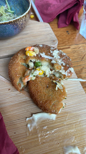 Colorful. Lots of interesting pictures on the wall. Comfortable seating if you're just having drinks and tables if you want to eat something.