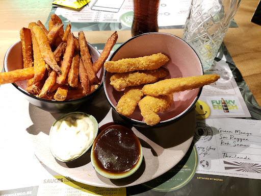 As a table of North North Americans visiting the #1 ranked burger joint in Brussels we had super high hopes. Didn't disappoint, didn't kill. The bun was a little too bready, the burger a little undercooked, and everything tasted a little bit like mayonnaise. HOWEVER! The flavours balanced on all three of our plates (grizzly burger (with bacon), le subtil, and DS "deluxe") with the winner going to the DS "deluxe" salmon burger. It was faaaacking good. Plus, the wine we ordered (pictures) really knocked it out of the park, it lightened up all the burgers and was quite playful.
