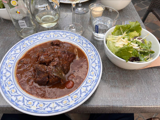 The menu is quite extensive; hot and cold starters, meat, poultry, fish and desserts however very little for vegetarians. A lot of dishes come with/in either a wine or beer sauce and most dishes seem to come with a small basket of frites. There's an extensive beer and wine menu as well.