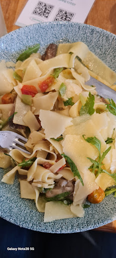 An astonishing experience. We were a table of 13 people. Before even welcoming us, they told us we could only get 5 different choices of dishes, no more or the chefs will not manage. But in fact this was not difficult, since they were out of pizzas and a few pasta choices as early as 1pm. Staff was unfriendly and completely lost despite the place was not even full, multiple people came to get orders and left without taking them with random excuses (but probably this is not the best place to work in). Pasta dishes can be all you want them to be, but they are certainly not Italian recipes. The way they are advertised is fraudulent: ortolana doesn't even have eggplants in, pappardelle ai funghi are floating in cooking water and roquette. It's like asking for a coffee and getting a tea instead. Our drinks arrived after we finished our dishes. And of course the prices...prices are not only above average, but if you compare them with a ridiculously bad cuisine, we all got the feeling we were robbed at gunpoint.
