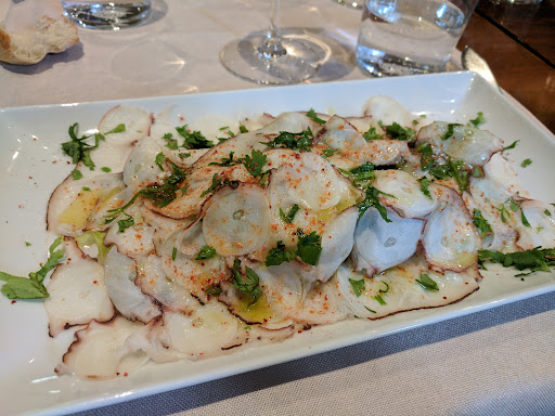 This place features a comfortable dining room as well as some outdoor seating. A wood fire is burning in a corner of the room, on which the steaks are cooked. This adds to the atmosphere and adds a slight smokey scent to the whole restaurant - this was more than fine by me, but I can imagine some people being less keen. I had a very nice octopus carpaccio and a really quite superb Argentinian vacio steak, served rare. The specialty of the house is clearly the meats, and some colleagues who had tuna steak were less happy (they felt it was overcooked). The chef who took our orders and looked after the table has quite a personality - again part of the experience, although it could rub some people the wrong way. The low point was probably his suggesting a 2010 Bordeaux bottle for the table, but opening a 2011 - a very different year. When this was pointed out to him, he simply said he'd run out of the 2010. All in all, a memorable experience, with the steak clearly...