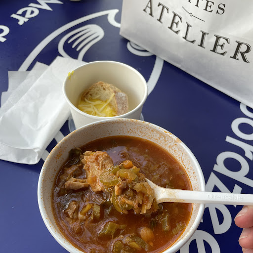 Read moreThis place was recommended to me by a local, and that's always a good thing. Don't go if you're looking for a fancy (or even nice) place to sit down inside for a quiet leisurely lunch. Definitely not! Go here if you want the most fresh seafood, prepared perfectly, and presented in an easy to carry (or balance or perch or rest) manner. There are only a few seats "inside" (there was a very generous outdoor seating area, but it was raining), so don't expect nice tables and chairs... And metal cutlery. But do go here for incredible seafood. It's part of a popular seafood market, so you can actually see (no pun intended) where you're food is coming from. The food is wonderfully prepared to bring out the natural flavors and wasn't camouflaged with overbearing sauces. I got the fish stew and the mussels, and just DAMN! It was cold and rainy, so the stew was perfection. I just took out all the mussels and added them to the stew, even better. Great local bread! Great local blonde beer! Great service!...