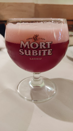 The waiter guided us to a 2p table, as soon as we arrived. I ordered a lasagna and my wife, a plate of spaghetti. To drink, a glass of juice and a glass of kriek (the "cherry beer"). I also ordered a parmesan fondue, but the waiter thought we were ordering grated cheese and since we only realized that when the main dishes arrived, there were no use asking for the starters anymore.