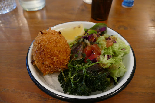 Yo fui a por las croquetas de gambas , hacen un concurso todos los años en Bruselas y quedaron segundos hace un par de años. Se pueden pedir por unidades, la croqueta va acompañada de ensalada , es grandecita , por dentro una bechamel cremosa y bien de gambas pequeñitas que usan. Buen rebozado, posiblemente la mejor croqueta que he comido fuera de España