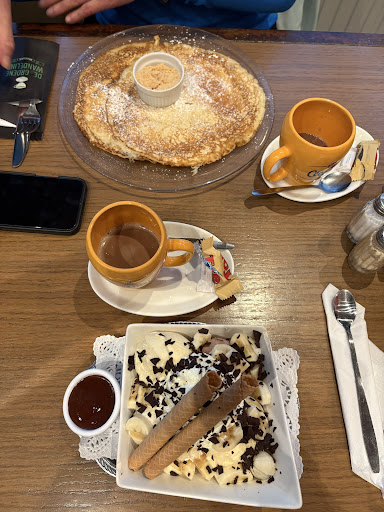 We kwamen hier al enkele keren, afgelopen jaren. Nooit hebben we echt klachten gehad buiten het sanitair wat verouderd is en daardoor ook moeilijker als hygiënisch is te beschouwen. We lieten het in het midden. Want de pannenkoeken die je daar kan eten vinden wij om vingers van af te likken. Ook andere gerechten die we zagen passeren deden ons eraan denken eens langs te gaan voor een lunch of diner. Maar nu wouden we eens met mijn ouders gaan voor een pannenkoek. Bij het opzoeken van het adres viel mijn oog op de recensies waarin vaak aangehaald wordt dat de bazin of het personeel bot is. We hadden dit eerder nog niet zo ervaren dus ik was benieuwd wat het deze keer zou geven. Aangekomen, plaatsje gekozen, tijdig werd onze drank opgenomen door een vriendelijke meisje en als we vroegen of we onze pannenkoek ook al mochten bestellen zei ze aardig dat ze dit eerst moest vragen in de keuken omdat "de pannenkoeken gevoelig liggen vandaag". Al een eerste teken van een raar sfeertje. Ze kwam terug en we mochten onze pannenkoeken bestellen. Oef. Alles goed gegaan, niet te lang moeten wachten en heerlijke pannenkoeken gegeten. Het meisje wist nota bene ook zelfs nog wie wat aan tafel had besteld. In tussentijd liep de zaak binnen en buiten vol. We merkten dat de tafels rond ons begonnen te vragen hoe het met hun bestelling zat, terwijl het meisje antwoordde dat ze moesten hopen en bidden dat ze er zou doorkomen. Niet erg professioneel, maar mijn inziens ook gewoon een verlengde van wat er in de keuken werd gezegd in combinatie met radeloosheid. Terwijl liep het personeel de benen vanonder het lijf. Plots passeerde het meisje dat ons had bediend en barstte in tranen uit. Toch vroeg ze nog of iemand iets wou en bleef ze doorgaan met het opnemen van bestellingen. Nog tot we doorgingen liep ze van hier naar daar, met de tranen in haar ogen. Sterk werk meid, maar ga daar niet meer terug. Ten eerste is het niet de bedoeling dat je werk of bijverdienste je zo onderuit haalt. En ten tweede zegt het genoeg dat een zaakvoerder je zo tussen de tafels van zijn zaak laat lopen, zelfs als je dat zelf zo zou gewild hebben. Wat een slechte reclame, en wat een arrogantie. Wij proberen de volgende keer de zaak ernaast wel eens. Hopelijk hebben die meer respect voor hun personeel en klanten. Ik hoopte eigenlijk een review te kunnen schrijven om de negatieve reacties hier een beetje te verzachten... Maar je personeel tot tranen drijven is 1 ding (ze kan een moeilijke dag hebben gehad of de druk even niet kunnen plaatsen) maar ze zo nog door de zaal laten lopen is voor ons helaas not done en getuigt in onze ogen van weinig respect voor je personeel...