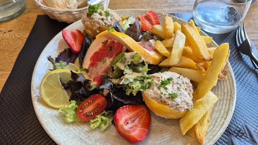 Les pêches au thon étaient un délice, parfaitement servies avec des frites croustillantes maison et une mayonnaise onctueuse, ainsi qu’une salade fraîche agrémentée de fruits d’été (fraises, citron et pamplemousse) qui apportait une touche de légèreté et de fraîcheur.
