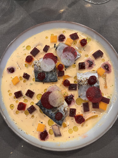 Read moreNous avons beaucoup entendu parler de ce resto et maintenant on comprend mieux pourquoi. Nous avons pris le menu 5 services. La qualité des plats est assez exceptionnelle. Dans chaque plat, il y a quelque chose qui reste en mémoire: le goût du wasabi dans le sushi, l alliance girolles - fromage de chèvre, une bisque incroyable qui est associée parfaitement au bar et au céleri, le jus hyper gourmand du cochon rôti. Et quel dessert aussi autour de l orange, aussi beau que bon. Le service est à la hauteur des plats, attentif, rigoureux et très sympa. On notera aussi une très belle présentation des vins et des thés. Déjà un incontournable de la gastronomie...