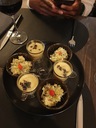 Ma compagne a choisi le velouté de petits pois avec de l'huile de ciboulette et de l'anguille fumée comme entrée, ce qui était une agréable découverte bien équilibrée. Cependant, j'ai été déçu par le Risotto à la bisque de homard et aux gambas sauvages que j'ai commandé car il était bien trop cuit (comme on peut le voir sur la photo).