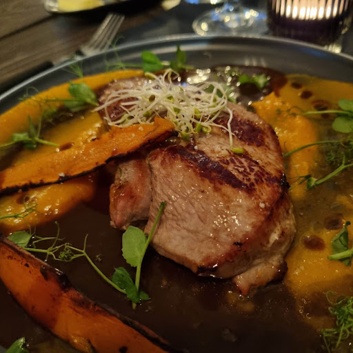 En plat principal, ma compagne a opté pour le bar aux agrumes et aux asperges vertes, mais a été déçue par ces derniÚres, qui semblaient "frites". Cependant, le bar était parfaitement cuit. Pour ma part, j'ai choisi le mignon de veau au jus de truffe et patates douces, qui était délicieux.