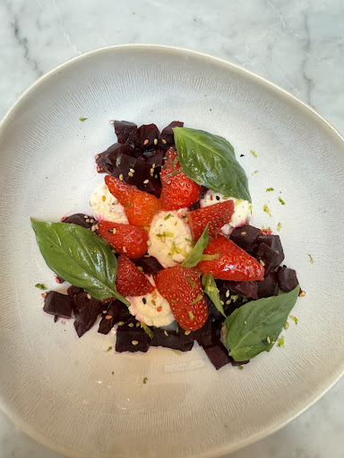 Pour notre plat principal, j'ai choisi la presa ibérique cuite à basse température, servie avec une mousseline de carottes primeurs, du chou-fleur grillé au zaatar, des tomates cerises et des pommes de terre grenailles au romarin. C'était un bon plat, même s'il était un peu moins surprenant que les entrées. Ma compagne a quant à elle opté pour les gambas grillées accompagnées d'une sauce yaourt aux algues, d'un taboulé de quinoa aux poivrons pointus, d'asperges vertes et de grenades, le tout parsemé d'herbes fraîches. Un plat délicieux et savoureux.