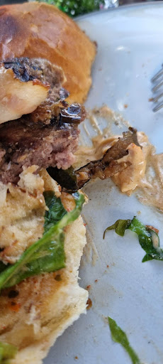 Le burger était bon en goût, mais n'était pas du tout copieux ! Trois bouchées et on n'en parlait plus ! Le burger était seul dans son assiette. Pas de crudités/salade. Servi avec un peu de frites à partager avec un autre plat (les moules). Pas de mayonnaise servie avec les frites.