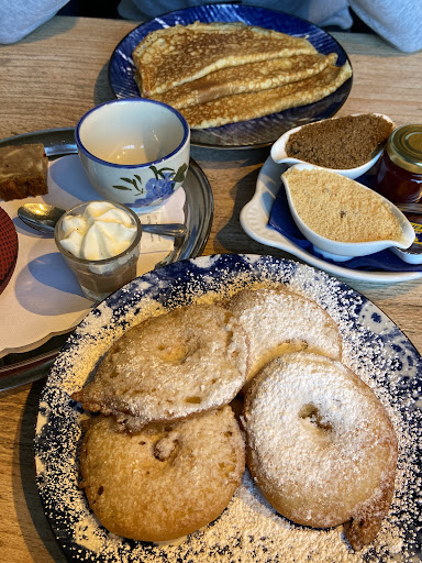mooie omkadering.... Maar we zijn om 15u18 aangekomen en kregen naar coronamaatregelen een tafel aangewezen. Na een 5-tal minuten kaart gekregen en nog iets later kwam een jonge dame onze bestelling noteren. Dus wij rustig wachten. Ik kom zelf uit de horeca en ik ben niet het type dat al na 10 minuten begint te zagen dat ik wat lang moet wachten. Dus ik wacht geduldig af. maar omdat we niet direct andere mensen een bestelling zien plaatsen en voor ons bediend zien worden, hebben we er geen erg in. De dame die onze bestelling genoteerd heeft passeert talloze keren zonder echt rond te kijken of alles in orde is. Het begint maar te dagen na goed 35 minuten wachten. Er zijn ondertussen 2 tafeltjes aangekomen, bestelling geplaatst en na 5 minuten hadden die al hun drankjes. Na 40 minuten wachten konden we eindelijk iemand met verantwoordelijkheid aanspreken. Die heeft dan gaan informeren in de keuken en aan de dame die onze bestelling had opgenomen. We kregen na enkele minuten de mevrouw terug te zien en kwam ons mededelen dat onze bestelling verloren was gegaan. Ondertussen werd de dame van de bestelling er ook al op gewezen dat er enkele fouten waren in het afrekenen met andere tafels. Dus toen moesten we terug onze bestelling plaatsen. Ik had er eerlijk gezegd niet veel zin meer in. Dus de blijkbaar lekkere pannenkoeken moest ik niet meer hebben. Ik heb enkel nog iets gedronken, de rest van ons gezelschap heeft wel nog alles genuttigd. Ter compensatie kregen we onze drankjes gratis. Maar wat ik niet begreep is dat de mevrouw die dit aanbood, plots vroeg of ik mijn pannenkoeken toch nog wilde, nu zelfs gratis, alhoewel ik dit niet vermeld had dat ik dit eerst besteld had. Zou het briefje plots toch boven water gekomen zijn? Geen idee Jammer, hoe lekker het hier ook is, hier geef ik geen...