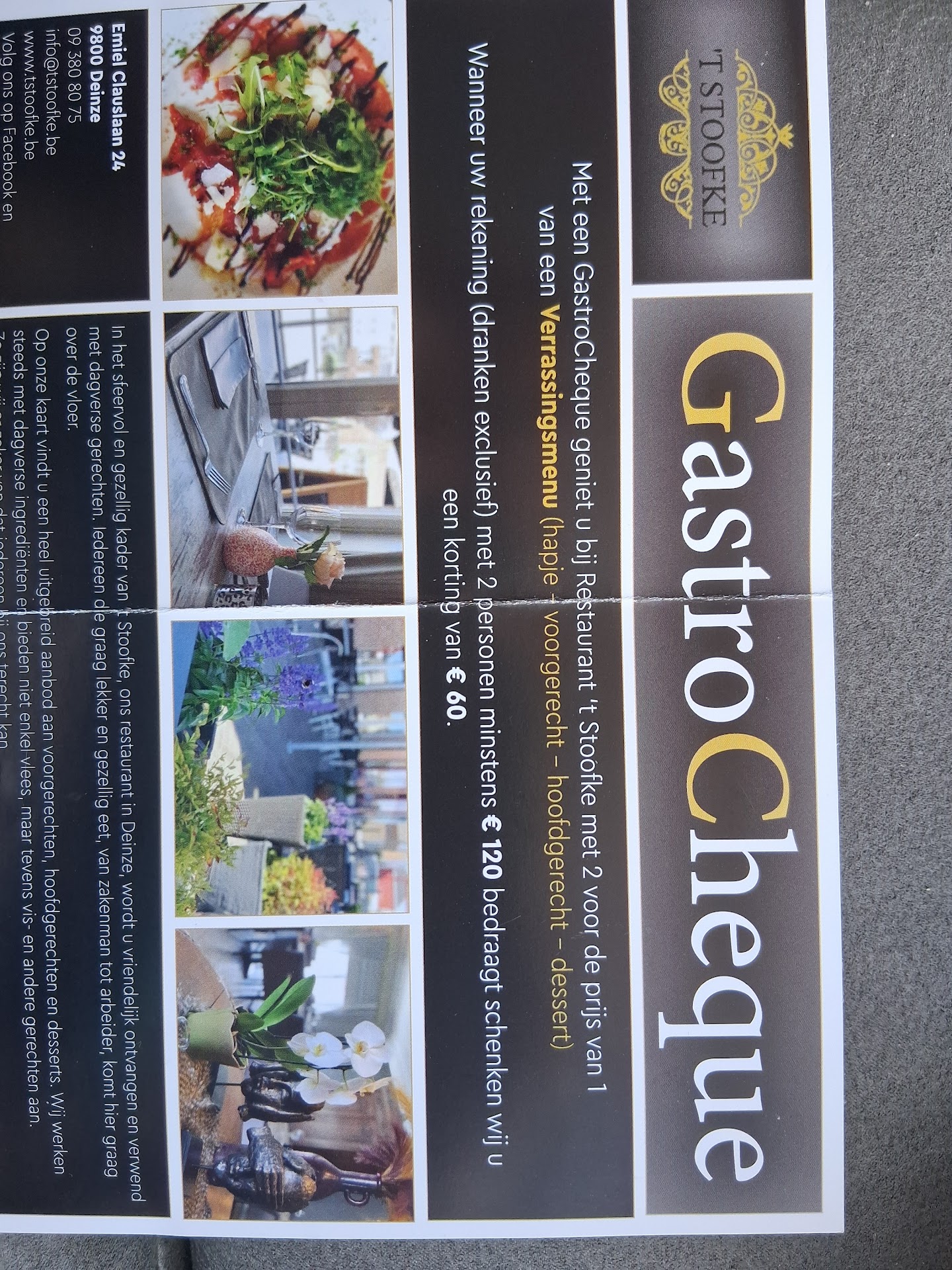 Read moreZondag avond op moederkesdag gaan eten. We hadden een gastrocheque waarbij we ELK voor 60,- euro konden eten (exclusief drank) maar we alleen in totaal voor 2 personen maar 60,- euro moesten betalen plus drank. Tot onze grote verwondering en tevens ontgoocheling tot en met kregen we geen menukaart en mochten we niet kiezen. Bijgevolg een triestig voorgerecht en een zeer minderwaardig hoofdmenu gekregen die voor ons beiden in totaal misschien 35/40 euro waard was dus dubbel en dik bedrogen !!! We hebben zelf nog zo´n gastrocheque die nu on de vuilbak vliegt !