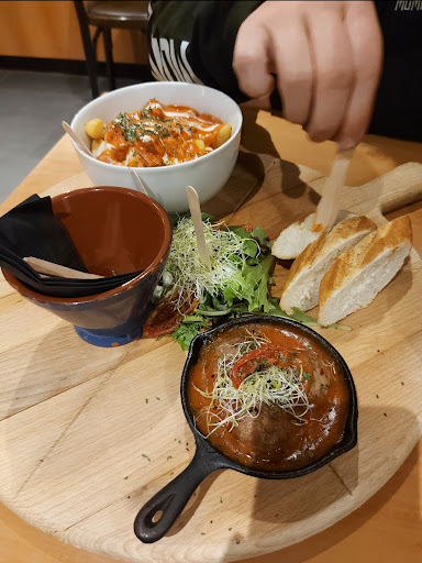 Read moreWij bestelden de tapasschotel. We kregen een bord waarvan de warme tapas bestonden uit verschillende gefrituurde dingen: kroketten, loempia's, kippenboutje, lange hamburger. Dat noem ik geen tapas. De koude tapas waren kaas en vlees, maar niet vers en niet van hoge kwaliteit. En daarnaast kommetjes vol ajuinen - haring - olijven. Brood moesten we extra bij vragen, maar dan kreeg je telkens een klein mandje voor een grote tafel. En voor de kinderen mini pizza en mini hamburgers: tevens diepvriesproducten, niets vers. De obers werken er met weinig goesting (ze staan met meer dan genoeg). Eén van de obers was aan het roken in de keuken! Maar toegegeven; de bar is leuk ingericht. Best gewoon...