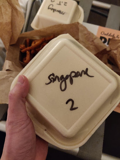 Now the main attraction. The meal of choice for tonight was the Singapore Chicken; a quirky but rather brilliant combination of Peanut sauce, Mango, and Bacon. The fries (by strict process of elimination) Were the most basic item on the plate; nevertheless they were still excellent. Choice of sauces was wide, and for once the hot sauce had some kick!