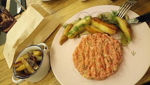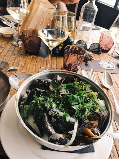 We aten hier met 2 op een koude decemberavond; De ontvangst was zeer vriendelijk de plaats aan het raam aan de straatkant was wat tochtig (het is het terrasdeal dat gesloten wordt na de zomer). We bestelden een tapa om te starten; de gebakken visreepjes waren zeer krokant en het sausje erbij was lekker. Het lokale Geeraert bier als apero was lekker maar veel te duur: 6.8€ voor een tripel is de moeite (in ons hotel kon je hem drinken voor 4€). Het hapje dat we aangeboden kregen met inktvis en garanaalkroketten die ik at als voorgerecht waren orrigineel gebracht en smaakvol. De Vitello van mijn ega was veel te veel tonato en bijna geen vitello, een alternatieve poging om vitello tonnato te serveren maar niet echt geslaagd. De bouillabaise die volgde was gevarieerd qua vissoorten (oa. zeer smakelijke rog) maar 8 toefjes rouille op de rand van het bord waren te veel, de toast was filterdun. De visfond die overbleef was te zout. Mijn echtgenote had wederon minder geluk: de hoevekip in kokos baadde in de kokos roomsaus, de droge koude stukjes spek op het gerecht hadden geen toegevoegde waarde integendeel ze stoorden in de mond. Als je iets speciaal wil doen met hoevekip ga je voor echte smaken en voeg je originele Oosterse accenten toe ofwel hou je het gewoon lekker klassiek; hier was het geen van beide. Te veel saus ... veel te veel "de keuken van de groottantes in de jaren 70-80". De witte wijn die we dronken was lekker.