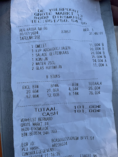Read moreWij waren op de markt in Diksmuide en wilden iets gaan eten. We bekeken wat reviews en vonden superplus en ook supermin commentaren van de Yserpoort. Ik weet niet waar de negatieve opmerkingen vandaag kwamen, misschien bij een verkeerde zaak geschreven... Het interieur is wat nostalgisch en warm. Mijn partner nam vol au vent Royal (met Mechelse koekoek) en ik nam de kalfszwezeriken. Beide gerechten waren zeer lekker. De frietjes waren een kwartier daarvoor nog hele aardappelen, dus vers gesneden en gebakken. We vroegen een wijnsuggestie en we kregen een goed glas rode wijn. De bediening was super en de dame, die eigenares is, ws zeer vriendelijk en deed na het eten nog een babbeltje met ons. Hier komen we...