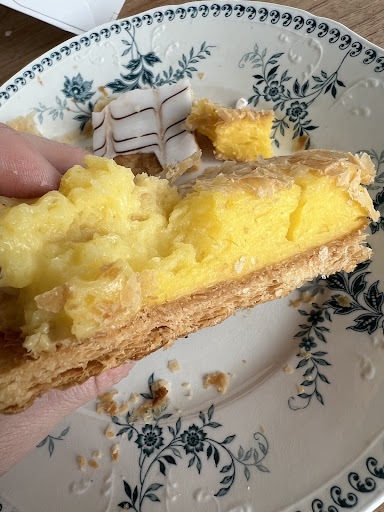Ik versta niet hoe je zo iets oud nog durft te verkopen, de crème van binnen had al een ander textuur en kleur als dat van buiten, koek helemaal oud, niet eens krokant. De appelflap was wel ok.