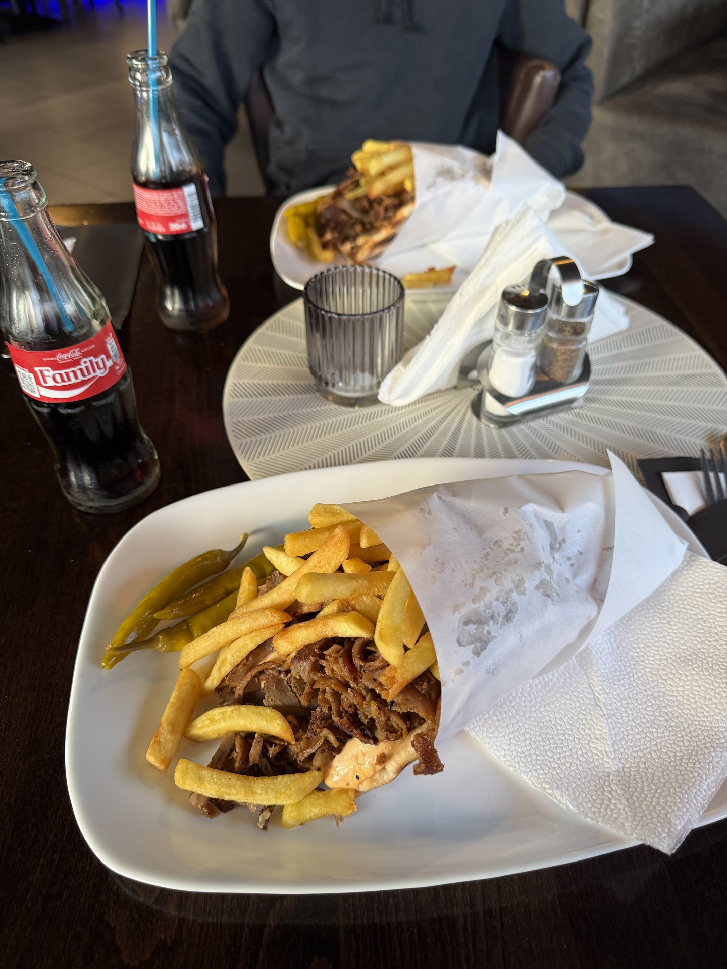 Hier een gyrosschotel en een gyrosschotel speciaal besteld. De gewone gyrosschotel was goed, zoals het hoort. De gyrosschotel speciaal was eigenlijk een smakeloos bakje eten. De gyros in een kom, dan ajuintjes, paprika en champignons overgoten met room. Duidelijk niet door een kok gemaakt, want die proeft een gerecht voor hij het doorgeeft, en dit gerecht was ECHT smakeloos. Let wel, het was niet vies, maar had gewoon helemaal geen smaak. Ik heb peper en zout moeten vragen om het ietwat smaak te geven. Er stonden 5 mensen in de keuken, maar niemand kon koken,...