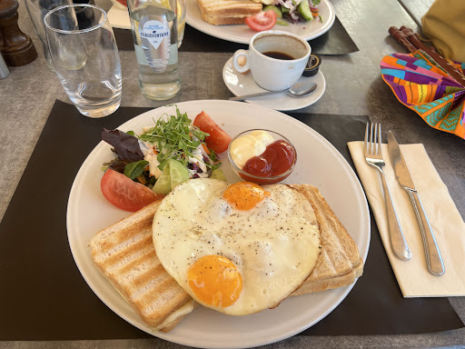 Men reisgenoot en ikzelf kozen voor de illustere “Croque Madame”, een klassiek gerecht dat hier op een bescheiden, zij het degelijke manier, werd gepresenteerd. De bereiding van de croque was ontegenzeggelijk eenvoudig, maar verre van ondermaats. Het bijbehorende saladebed was verfrissend en harmonieus samengesteld. Het spiegelei, hoewel perfect gepresenteerd aan mijn zijde van de tafel, vertoonde bij mijn disgenoot een lichte tekortkoming in vakmanschap, waarbij het eigeel de gewenste vloeibaarheid miste. De royaal verstrekte saus, een zegen voor de saus-aficionado’s, was een lovenswaardig aspect van de maaltijd.