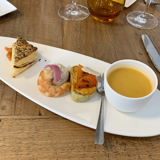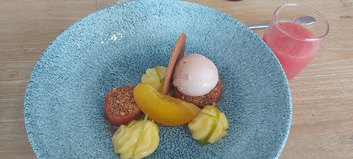 Wij waren hier met een groep van 10 op een zondagmiddag tijdens een weekend in een vakantiehuis in deze prachtige streek. Druk beklant restaurant met veel lokale klanten. Wij namen allen het 3-gangen keuzemenu. De 4 hapjes die bij het aperitief werden geserveerd beloofden veel voor het vervolg. Als voorgerecht had ik een prachtig gerechtje met kleine inktvisjes en bloedworst. Het hoofdgerecht was wat minder aangezien het rundsvlees voor enkelen onder ons veel te ver gebakken was. Het dessert was voor mij te speciaal met onder andere aardpeer in verwerkt maar anderen in de groep vonden dit dan wel zeer lekker. Prijs-kwaliteit een zeer goed ervaring. Bijzonder was ook de aandacht de hier wordt besteed aan lokale producten en leveranciers alsook aan het gebruik van groenten uit eigen tuin. Een aanrader voor mij, zelfs al zijn er wat...