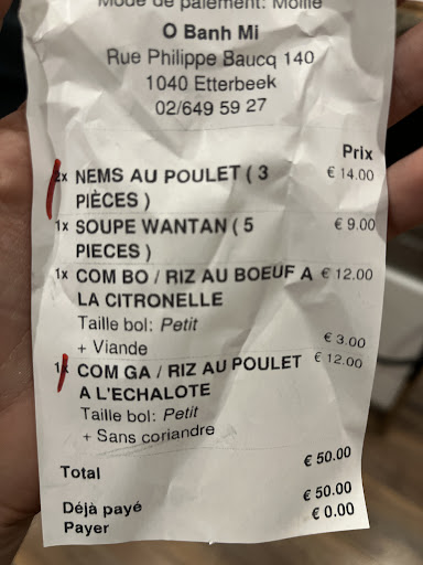 Ô Banh Mi in Brussels is a delightful spot that brings the vibrant flavors of Vietnamese street food to the heart of the city. From the moment you arrive, you’re greeted by a cozy and inviting atmosphere, making it a perfect place for a quick lunch or a relaxed dinner. The décor is simple yet charming, and the small terrace is a lovely bonus on sunny days. The star of the menu is, of course, the banh mi sandwiches—crafted with fresh, crispy baguettes and a variety of flavorful fillings. Favorites include the pork belly, lemongrass chicken, and tofu options, all bursting with authentic spices and fresh herbs. Each bite is a harmonious blend of textures and tastes, transporting you straight to the streets of Vietnam. The menu also features delicious bowls, spring rolls, and shrimp soup, ensuring there’s something for everyone. Service at Ô Banh Mi is friendly and efficient, with staff happy to recommend dishes and accommodate preferences. Prices are reasonable, and the quality of ingredients truly stands out. Whether you’re a longtime fan of Vietnamese cuisine or trying banh mi for the first time, this spot is sure to impress. Highly recommended for anyone seeking fresh, authentic, and satisfying Vietnamese food...