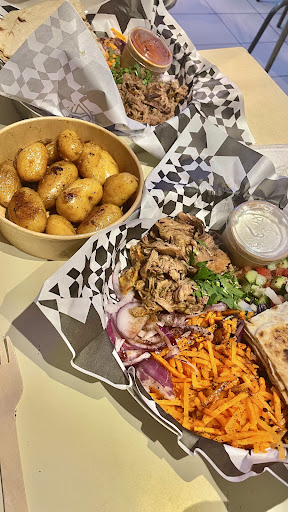 What a wonderful find! I lived in the Middle East for 17 years, so I'm always drawn to this type of food. We ordered the smoked chicken platter and the Syrian platter. The chicken was shredded, tender, and full of flavor. Both platters came with a colorful coleslaw salad, a green wheat salad (freekeh), mutabal (aubergine), and a tasty garlic sauce. The Syrian platter also came with falafel, halloumi cheese, and hummus. Everything was delicious!
