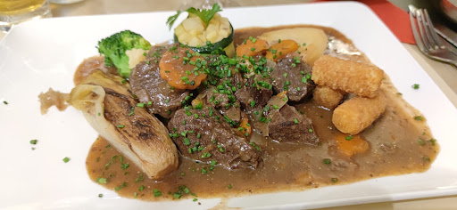 Read moreUn petit restaurant de quartier (place de la Paix à Evere) sympathique. Une déco agréable mais assez minimales et, un peu froide. Pourtant il en faudrait peu pour réchauffer l'atmosphère. Accueil souriant et agréable, pourtant c'est ma première visite. Les deux accueillantes sont très attentives. Apero, choix entre menu et carte. Quand je les trouve à la carte, je n'hésite jamais à prendre des rognons de veau. C'est un test impitoyable pour le cuisinier. Les rognons doivent être tendre et chauds, même rosés. Servis sur une assiette chaude à souhait, accompagné de croquettes de pommes de terre parfaites, d'une sauce dijonaise qui aurait pu être un peu plus piquante, les rognons se sont révélés être parfaitement rosés, goûteux mais, malheureusement un peu trop ferme sous la dent. Accompagné d'une demi bouteille de Bordeaux et d'un café l'addition est quand même de plus de 50€...