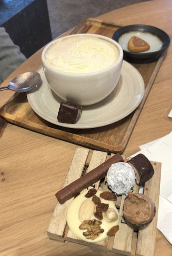 Read moreOp weg naar huis binnen gesprongen bij de koffieschenkerij voor een afsluitertje na een restaurantbezoek. We namen de suggestie: koude chocolademelk met een toets van framboos. Ik vond het meer koude framboosshake met een toets van chocolade. Maar was hoe dan ook lekker. We namen elk een bordje met 5 lekkernijen...... amaai was lekker. Zeer tof interieur en ik kijk er al naar uit om eens langs te komen in de winter. Het interieur zal dan nog meer tot zijn recht komen. We komen hier zeker nog terug! ...