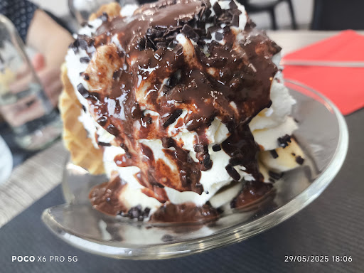 Cet établissement propose des sandwiches, petite restauration, gaufres, crêpes et glaces. L'accueil est très cordial, les sandwiches sont copieux, servis sur assiettes avec des crudités. Nous avons vu passer des assiettes de pâtes qui semblaient délicieuses et étaient très en tous cas copieuses. Nous avons pris des glaces en dessert et nos coupes, à l'instar du reste étaient délicieuses, servies esthétiquement et en quantité. Mon épouse n'a d'ailleurs pas pu terminer la sienne. Le personnel est prévenant, courtois et professionnel. Nous y retournerons sans aucun doute. Les prix sont plus que raisonnables au vu de la qualité des...