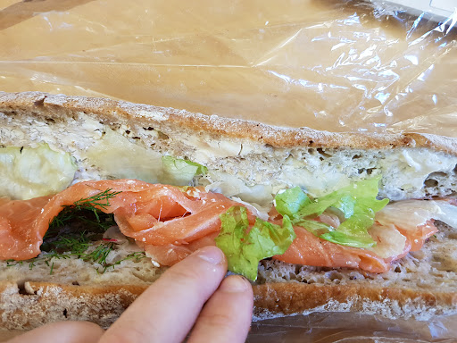 Cette fois ci, en plus de devoir subir le soupir de rĂąle de la vendeuse au comptoir que je supporte d'habitude, j'ai eu droit Ă un sandwich expĂ©ditif ! Constater le par vous-mĂȘme sur les photos ! D'accord il y a du saumon, mais s'il vous plaĂźt, ne me dite pas qu'il n'y a aucun problĂšme. Quasi inexistance de la salade et du Philadelphia, trois misĂ©rables tranches de radis de 0,00001 millimĂštres d'Ă©paisseur et des herbes... Pour 6 euros et 20 centimes, nous sommes trĂšs loin de la qualitĂ© de d'habitude.