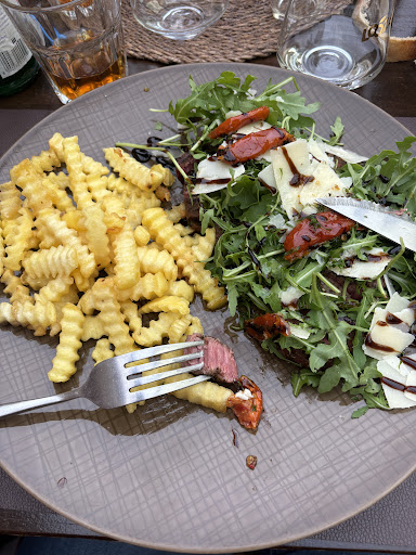 Planche de charcuterie à 32 € (poitrine fumée fade, olives sèches, charcuterie banale), escalope ultra fine, cuisson non respectées pour le bœuf, les viandes masquées par une quantités astronomique de sauce insipide, peut être pour masquer la piètre qualité de la viande, frites sans goût (surgelées ?), nuggets enfants idem. On nous répond que tout est fait minute et que « le dimanche on a le temps »… sauf que tout n’a clairement pas l’air frais.