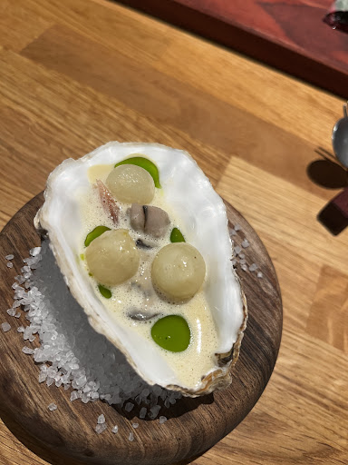 Superbe endroit, Des tables espacées et spacieuses c’est tellement agréable. Le service va un peu vite, passe de 2 à 4 puis à 6 mains. Les produits sont soignés, les vins sont agréablement sélectionnés. Petit « hic » il faudrait annoncer le vin, avant de servir ou simplement faire goûter une lichette, ça éviterait le gaspillage. (Ceci n’engage que mon ressenti) Proposer une sélection d’eau aromatisées maison pour les sans alcools c’est vraiment un plus. Le pain levain maison est splendide, le beurre du moment (curry rouge et chair de homard) est splendide. Il y a un peu de régularité dans les éléments d’assaisonnement (herbes, épices… mais le zéro waste justifie le choix) Petite remarque, j’ai trouvé personnellement la justesse des cuissons un peu trop « goût des chefs nu-school » *La raviole de bœuf était vraiment beaucoup trop al denté à mon goût. *La queue de homard manquait d’une petite minute pour atteindre le moelleux nécessaire. *La caille était un brin trop rosée à notre goût, juste l’appoint qu’il manquait pour qu’elle se détacher de l’os sans ronger. *L’idée d’assaisonner d’herbes fraîches et du jardin plutôt que de sel et de poivre est dépaysante mais très apprécié. La possibilité d’une note de flocons de sel sur le carpaccio de bœuf saumuré aurait vraiment été un plus. C’est un parti pris, clairement assumé et ça marche ! Mais il manquait un petit quelque chose « conventionnel ». Nous sommes ravis de notre expérience. Dépaysement au...