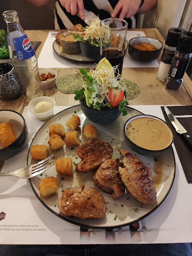 Bij aankomst was er gelukkig nog 1 plaats vrij. Volle zaal en terras. Binnen het half uur eten gekregen. In afwachting rondkijkend: alle uitgaande borden waren verzorgd en meer dan ok. 28,5€ voor steak, met saus, en 1 frisdrank. Een aangename eetervaring, desondank de brandweer, politie en bussen die de weg blokkeerden op 3 meter afstand na een heel avontuur. Zeker voor herhaling vatbaar! Aanrader! Zalige bearnaise saus! Voorverwarmd bord. Zeer verzorgd slaatje met uiteraard te weinig lekkere dressing 😉. Klein minpunt dat ook een pluspunt was: saignaint gevraagd, maar het was mooi rood. Het vlees smolt weg in mond.. Kwaliteit eten 9+/10, service gezien drukte 9/10. Heerlijk eten, onverwacht, op...