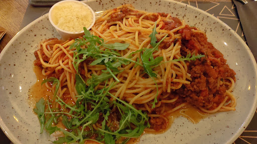 Although it seemed pretty busy, someone greeted me and saw me to a single table then reappeared with a bag of bread and took a drink order whilst I waited. I plumped for the bolognaise, which came with a small paper carton of ground parmesan and decorated with peppery rocket.. but that amount (plus breads) were sufficient to hit the spot.