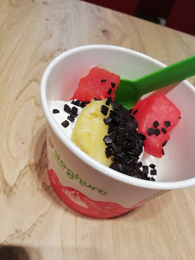 De joghurt ijs heb ik ook gegeten, jammer dat ze geen Vegan ijs of suikervrije joghurt ijs opdat moment hadden, ze hadden 6 smaken, incl de natural. Je kunt daarna de toppings kiezen die je op je ijs kunt leggen. Ananas, watermeloen, chokolade, speculaas,..enz.. Nadeel is dat het fruit niet gekoeld is, het ligt er in plastieken potjes onder lampen, misschien hier eens aandacht aan besteden? De chokolade of speculaas kunnen er wel onder staan, maar fruit... Dit was ook niet meer vers, jammer. Als jullie daarop kunnen inspelen om dit te koelen, dan waren het dikke 5 sterren.