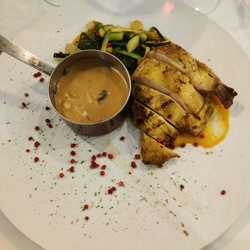 Voor we ons hoofdgerecht kregen hebben we !!1,5u!! Moeten wachten... ze waren ons 'vergeten'... Als hoofdgerecht kregen we parelhoen, met aardappel gebakken in de schil, mini courgette en een mousse van champignons. Dit was lekker en zeer verzorgd, maar jammer genoeg was het, desondanks het lang wachten, toch niet meer zo warm. Waardoor de smaken minder aanwezig waren.