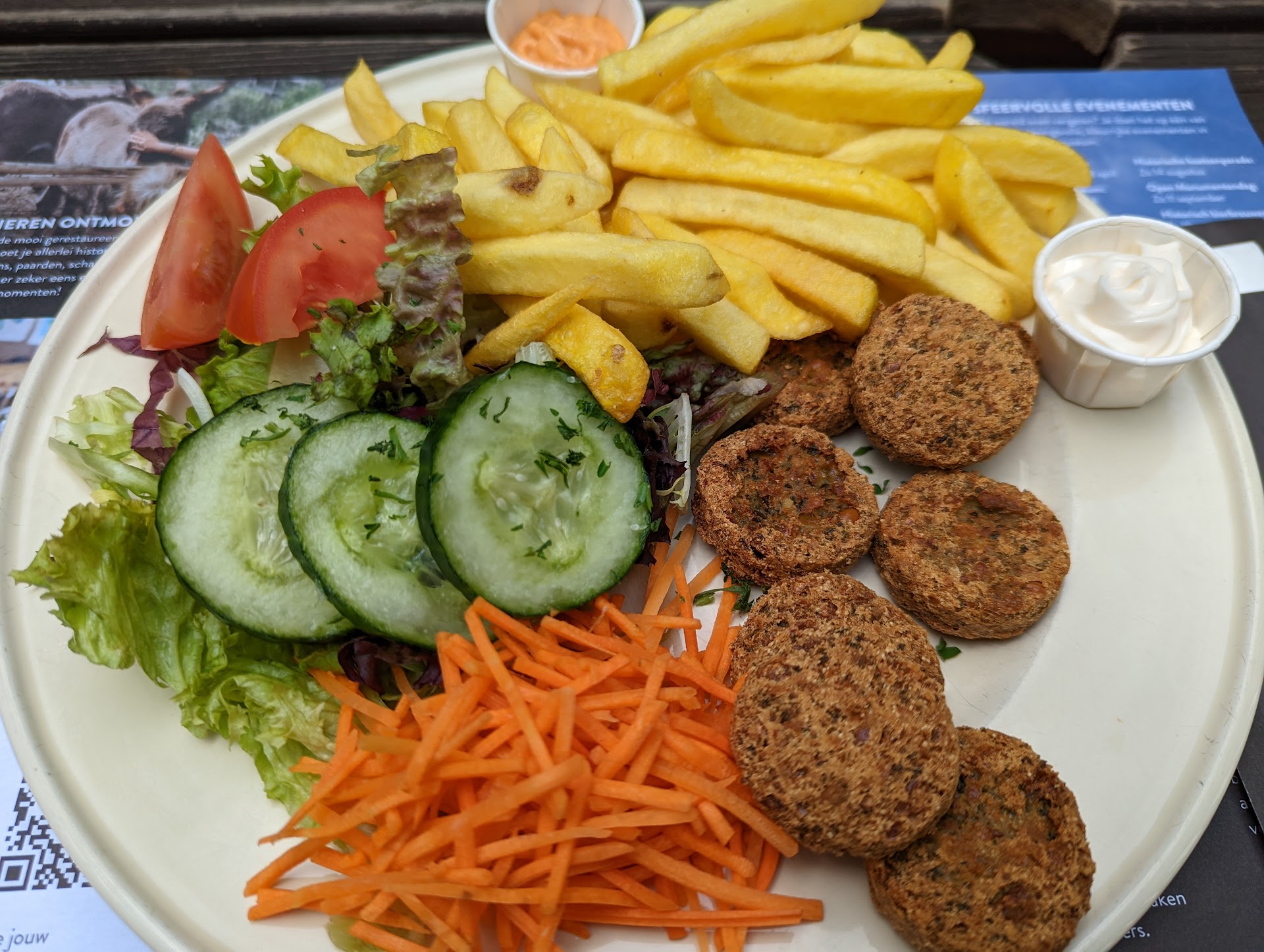There's 2 vegan options and one vegetarian, which is more than I would expect in many places. Even though the vegan options are only tomato soup, or falafel with hot chips (the classic sole vegan offering worldwide), it was nice to be able to eat something. The falafel were tasty, and not as dry as they look on the outside (they were moist, actually, pretty good). They gave 2 vegan sauces with it (mayonnaise and andalouse). The staff were...