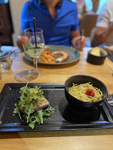 Ensuite, ma compagne a choisi le filet de bar avec une sauce tomatée aux olives et aux câpres, accompagné de frites et de légumes maison. Le poisson était parfaitement cuit et accompagné d'une sauce délectable. Pour ma part, j'ai opté pour les pâtes aux vongolés et au poulpe.